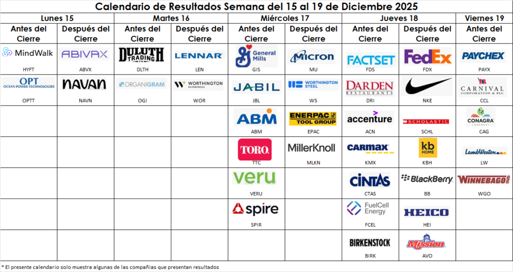 📅 Calendario de resultados empresariales | Semana del 15 al 19 de diciembre 2025 FedEx, Nike, Micron, General Mills y PaychexBlog / cultivandoinversion.com 📅 Calendario de resultados empresariales | Semana del 15 al 19 de diciembre 2025 FedEx, Nike, Micron, General Mills y Paychex Leer más »